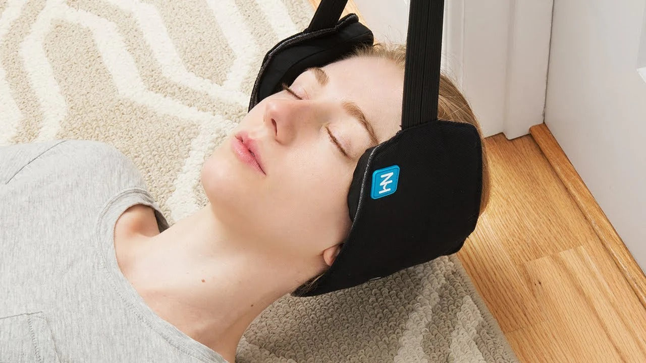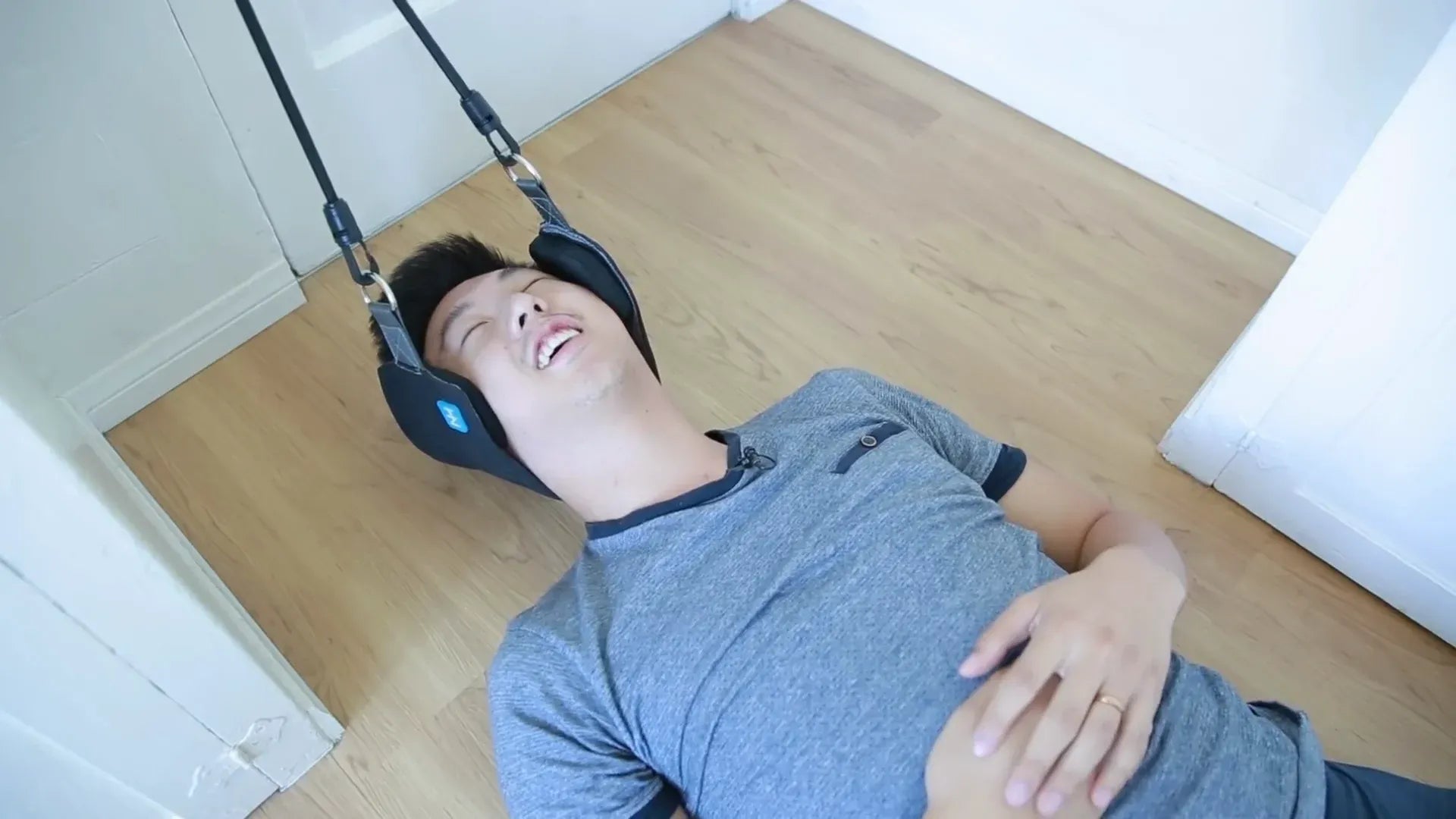Se fija a una puerta o superficie estable. Al recostarte, el dispositivo aplica tracción cervical suave que descomprime vértebras y relaja músculos.