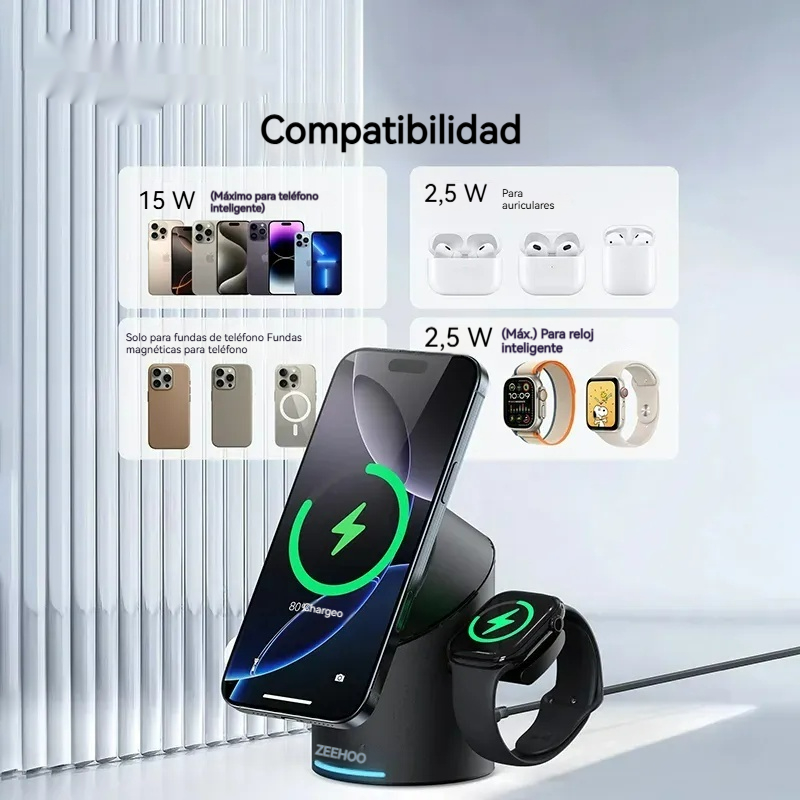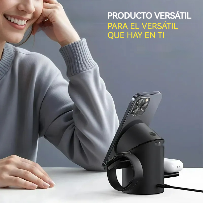 Carga tu iPhone, tu reloj y tus auriculares al mismo tiempo. Sin enredos. Sin excusas.